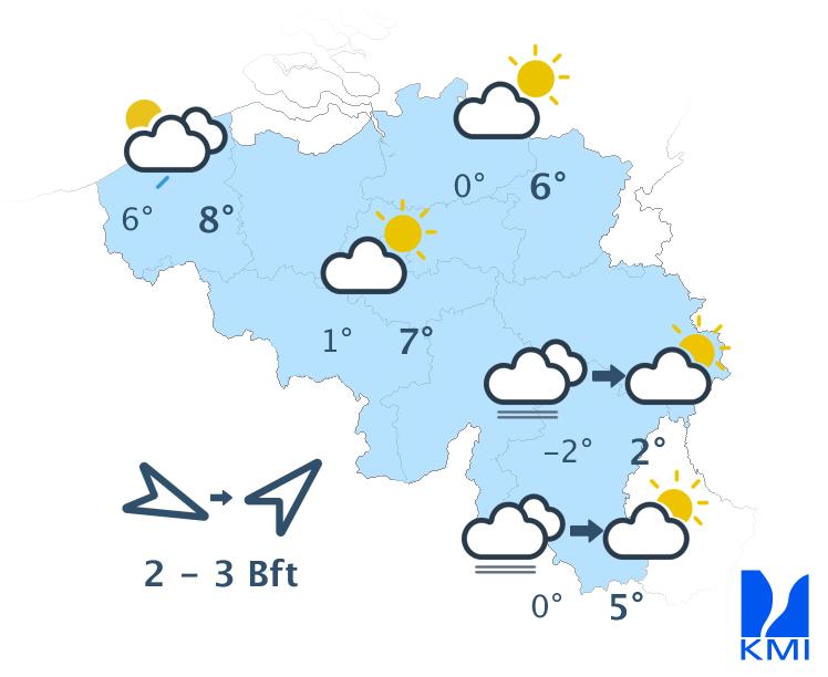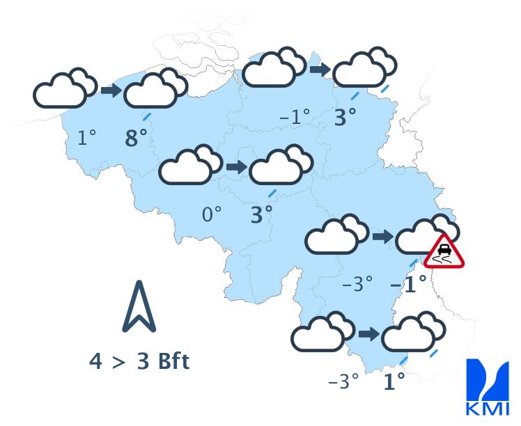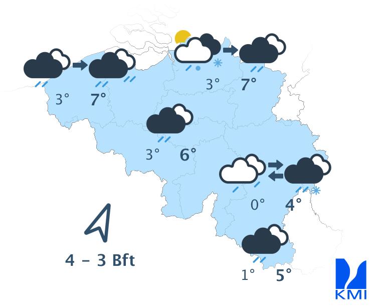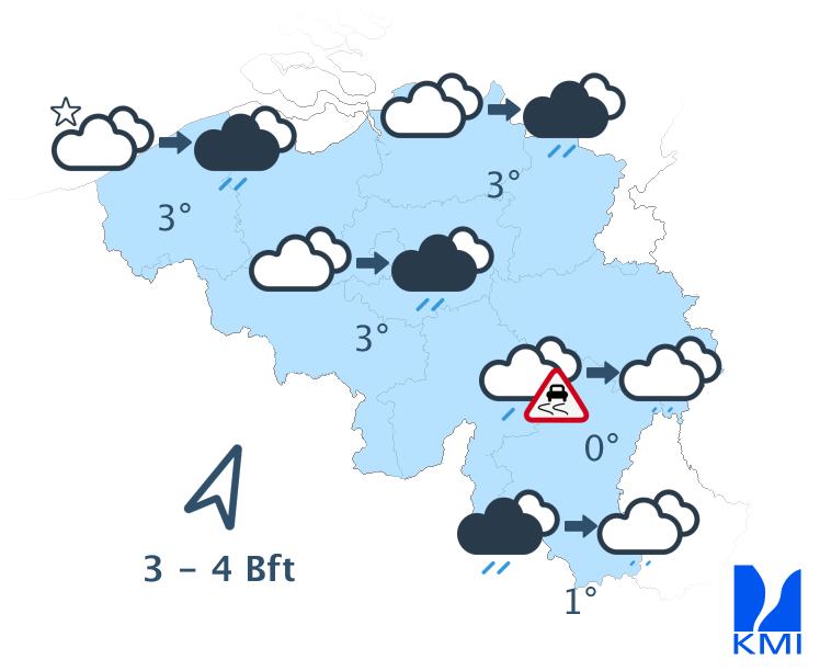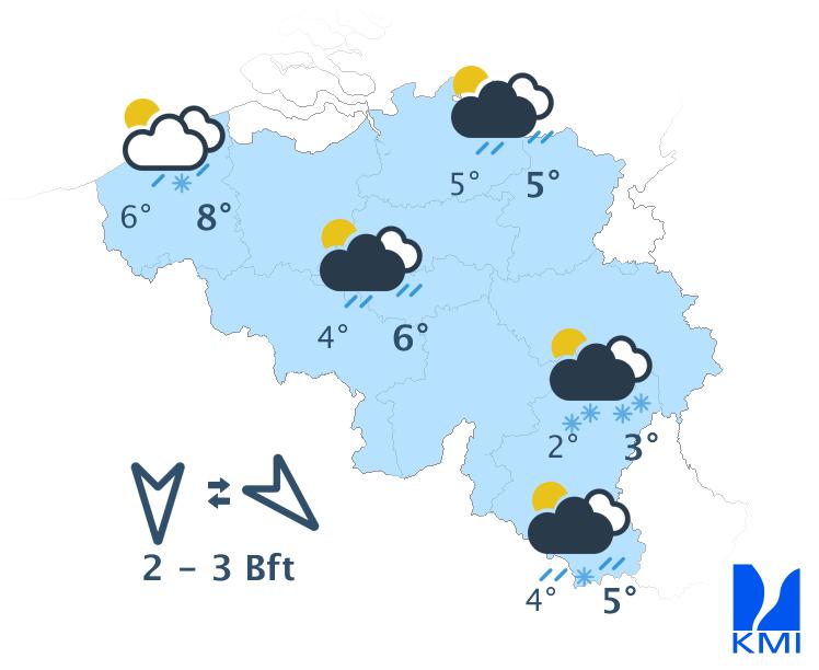 Morgenochtend is het betrokken met eventueel nog kans op een beetje sneeuw in het centrum en het oosten. Op het einde van de voormiddag bereikt een nieuwe neerslagzone het westen van het land en in de loop van de namiddag spreidt deze zich uit over heel het grondgebied. Terwijl de neerslag in het westen vooral in de vorm van regen valt, kan deze verder landinwaarts een winters karakter krijgen. In Midden-België is er dan kans op smeltende sneeuw, maar in de Ardennen kan de eerste neerslag in de vorm van sneeuw vallen. Er is ook kans op aanvriezende regen, vooral in het zuidoosten van het land. De maxima liggen tussen -2 graden in de Hoge Venen en +8 graden aan de westkust. De matige tot vrij krachtige zuidenwind ruimt in de namiddag naar zuidwest. Aan zee zijn er rukwinden mogelijk tot 70 km/h, in het binnenland eerder tot rond 50 km/h.