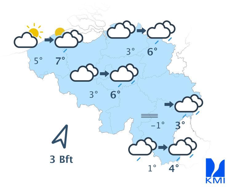 Maandag is het vaak zwaarbewolkt met regen en buien. Op de Ardense hoogten kan de neerslag soms nog wat winters zijn. De maxima liggen rond 2 graden in de Hoge Venen, rond 6 graden in het centrum en rond 7 graden aan zee. De wind waait matig uit zuidwestelijke richtingen.