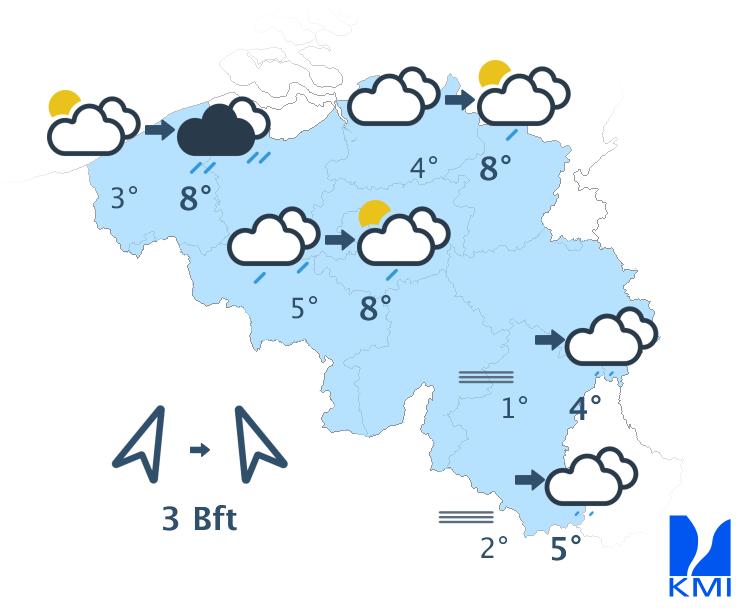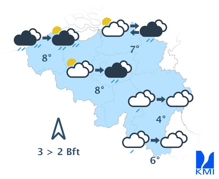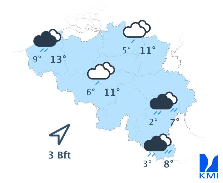 Deze namiddag is het zwaarbewolkt met tussendoor slechts enkele korte opklaringen. De (winterse) buien in het oosten verlaten ons land en worden gevolgd door nieuwe (soms felle) regen vanaf het westen en de kust. Deze neerslag bereikt pas in de avond het oosten en verliest dan aan intensiteit. In het westen zijn er dan buien die vergezeld kunnen zijn met korrelhagel. De maxima liggen tussen 2 of 3 graden in de Hoge Venen en 7 tot 9 graden in Laag- en Midden-België. De wind waait zwak tot matig uit zuidelijke richtingen. In het uiterste westen draait de wind nadien naar noordelijke of veranderlijke richtingen.