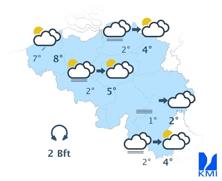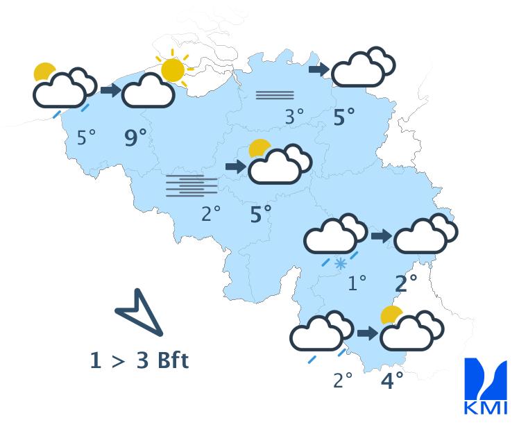Woensdagochtend verwachten we over de oostelijke landshelft lage wolken en lokale mistbanken; over het westen zijn er meer opklaringen met plaatselijke mist. Overdag wisselen op de meeste plaatsen opklaringen en wolken elkaar af, maar in de Ardennen blijft het vaak grijs. Aan zee kunnen er af en toe enkele buitjes vallen en in de Ardennen is wat lichte (winterse) neerslag bij tussenpozen mogelijk. Elders blijft het overwegend droog. De maxima schommelen tussen 1 en 3 graden in de Ardennen, rond 4 à 5 graden in het centrum en van 6 tot 8 graden over het westen. De wind is zwak en veranderlijk. Aan zee draait de matige noordenwind naar het westen.