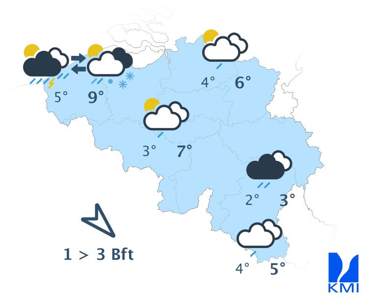 Morgenvroeg zijn er in het uiterste westen enkele opklaringen maar ook buien met eventueel onweer en korrelhagel. In het centrale deel van het land is het droog en zijn er meer opklaringen met kans op (aanvriezende) mist en zeer lokaal vorming van ijsplekken. In de loop van de dag wordt het in Laag- en Midden-België wisselvallig met een afwisseling van zwaarbewolkte perioden met buien en opklaringen. De kans op neerslag (en ook korrelhagel en onweer) is het grootst in het westen van het land. In het oosten is het gans de dag zwaarbewolkt met af en toe lichte neerslag. In het reliëf kan dit nog winterse neerslag zijn en is er soms slecht zicht. De maxima liggen tussen 2 graden in de Hoge Venen en 9 graden aan zee. De wind wordt zwak tot matig uit het noorden tot noordwesten in het binnenland en vrij krachtig tot soms krachtig uit het noorden aan zee. Rukwinden tot 70 km/u of wat meer tijdens een bui zijn daar mogelijk.
