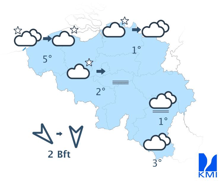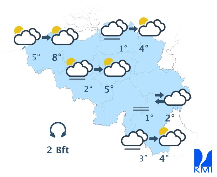Woensdagochtend verwachten we over de oostelijke landshelft lage wolken en lokale mistbanken; over het westen zijn er meer opklaringen. In de loop van de dag krijgen we mogelijk bredere opklaringen met hoge wolkenvelden. In de Ardennen echter blijft het vaak zwaarbewolkt. Het is overwegend droog op wat lichte (winterse) neerslag in de Ardennen na. De maxima liggen tussen 1 graad in de Hoge Venen en 8 graden aan zee. De wind is zwak en veranderlijk. Aan de kust draait de matige noordenwind naar het zuidwesten.
