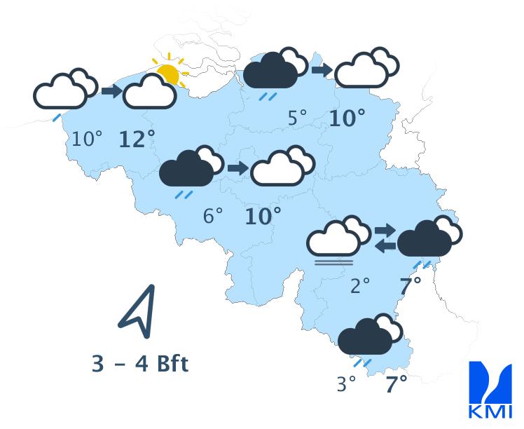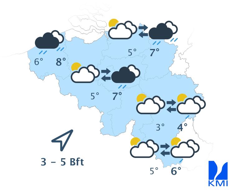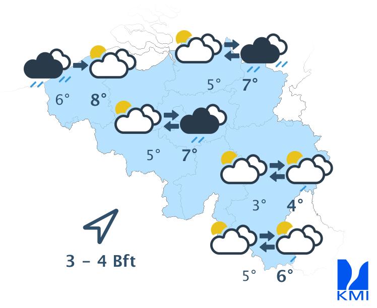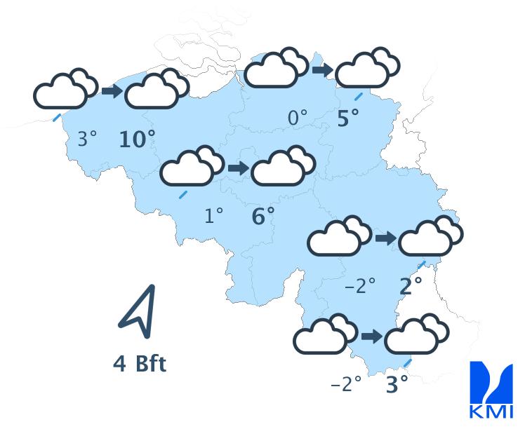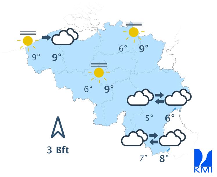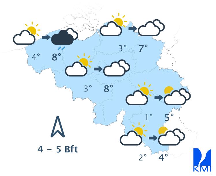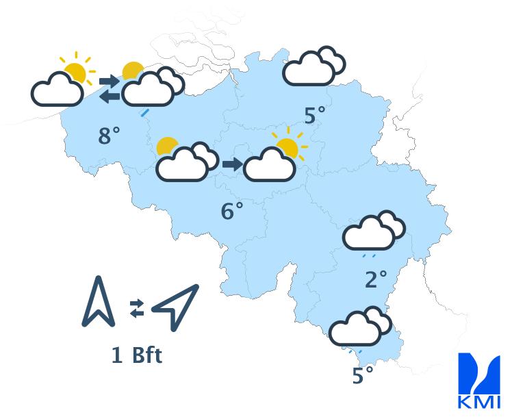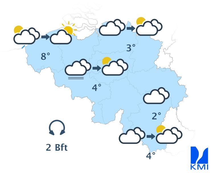 Deze namiddag blijft het over de zuidoostelijke landshelft grotendeels grijs met kans op wat gemiezer of eventueel wat motsneeuw op de hoogste toppen. In het westen van het land worden de opklaringen in de loop van de namiddag geleidelijk breder, maar kan er ook wat meer hoge bewolking ontstaan. Een lokaal buitje aan de kust is ook niet volledig uitgesloten. De maxima liggen rond 1 à 2 graden in de Hoge Venen, rond 5 à 6 graden in het binnenland en rond 7 à 8 graden aan de kust. De wind waait zwak uit noord to noordwest in de zuidoostelijke landshelft en meestal uit zuid tot zuidwest elders. Tijdelijk wordt de wind veranderlijk. Aan de kust waait de wind eerst zwak tot matig uit zuid en later zuidwest tot west.