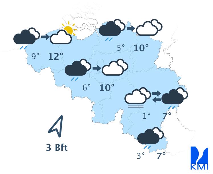Morgen blijft het grotendeels grijs met lichte regen. In de namiddag wordt het geleidelijk droger vanuit het westen. In het zuidoosten blijft het licht regenen tot de avond. De maxima liggen rond 1 graad in de Hoge Venen, rond 5 à 6 graden in het centrum en rond 10 à 11 graden aan de kust. De wind waait matig uit zuidzuidwest.