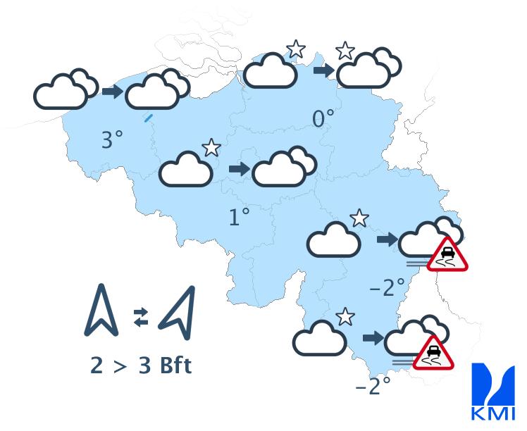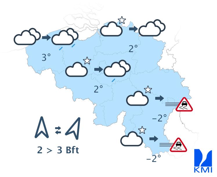 Vanavond zijn er eerst nog opklaringen, maar in de loop van de nacht wordt het betrokken en trekt vanuit het westen een zwakke storing binnen die voor wat lichte regen kan zorgen. In het zuidoosten blijft het wellicht nog droog tot het einde van de nacht. Op sommige plaatsen kan er nevel of mist ontstaan en vooral in de Ardennen is er kans op dichte (aanvriezende) mist. De minima liggen tussen -3 en 0 graden in de Ardennen, rond 2 à 3 graden aan de kust en tussen 1 en 3 graden in de rest van het land. De wind waait eerst zwak en later matig uit zuid tot zuidzuidwest.