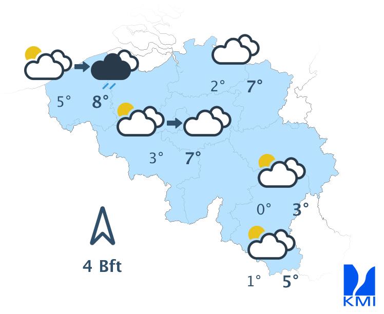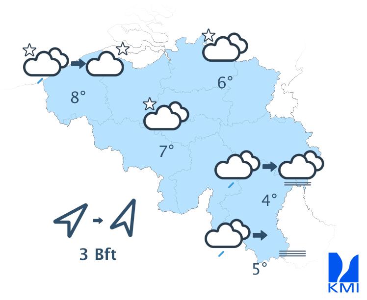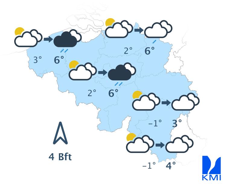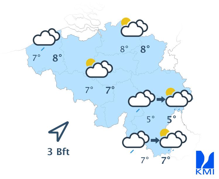 Morgenochtend is het nog zwaarbewolkt met regen of motregen op veel plaatsen en op de Ardense Hoogten is het zicht beperkt door laaghangende bewolking. In de namiddag wordt het van de kust tot het centrum droger met wellicht enkele opklaringen over het westen. De maxima liggen tussen 4 à 5 graden op de Ardense hoogten en 11 of zelfs 12 graden aan zee. De matige wind uit zuid tot zuidwest draait naar zuidwest en wordt soms vrij krachtig aan zee.
