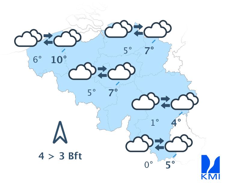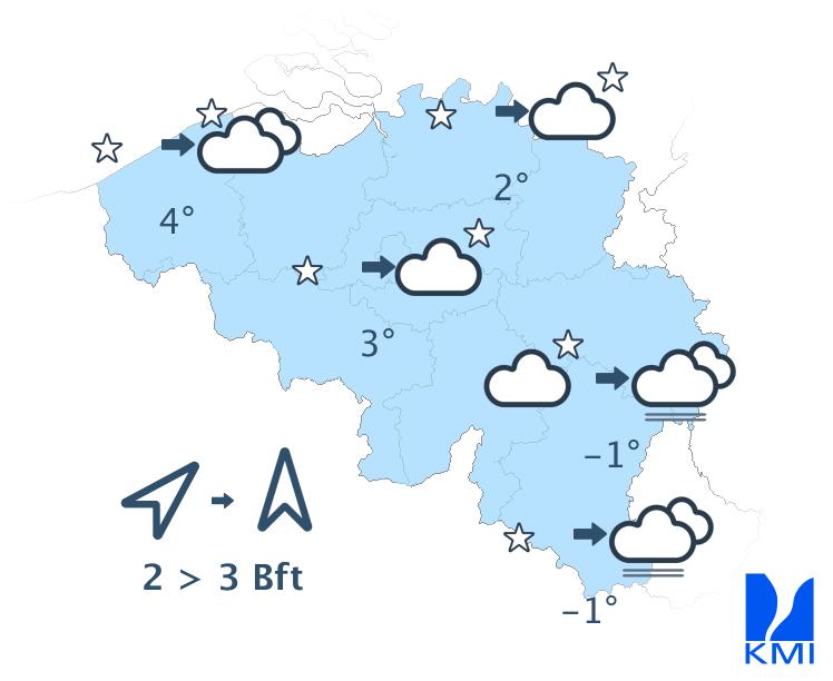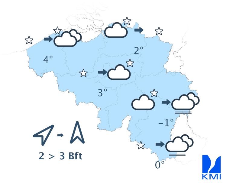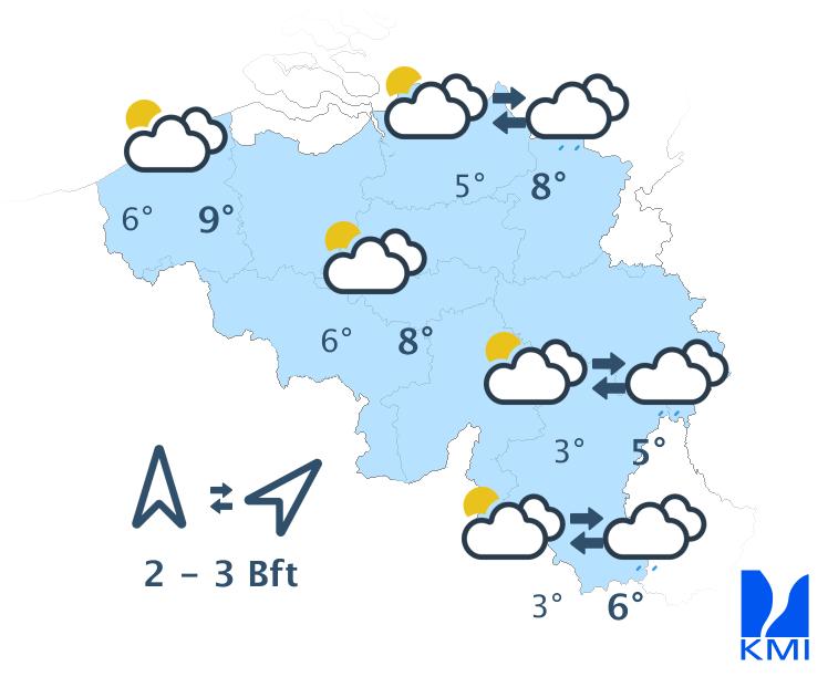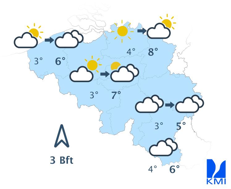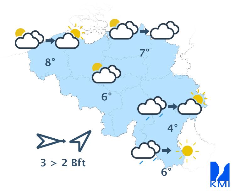 Vanmiddag is het vooral in de oostelijke helft van het land op veel plaatsen nog bewolkt en vooral in de Ardennen kunnen er nog enkele buitjes vallen. In het westen zijn er al zonnige perioden, en geleidelijk breiden deze zich ook uit naar de andere streken. In de gebieden langs de grens met Nederland kunnen er tot vanavond meer wolkenvelden blijven plakken. De maxima liggen rond 4 graden op de Ardense hoogten, rond 6 graden in het centrum en rond 8 graden aan zee. De matige westenwind krimpt naar het zuidwesten en neemt wat af. In de zuidelijke helft van het land wordt hij geleidelijk zwak.