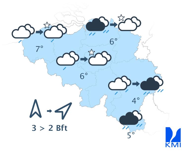 Morgenochtend zijn er nog opklaringen in het oosten van het land, maar geleidelijk neemt de bewolking verder toe vanaf het westen. In de namiddag gaat het licht regenen of motregenen in het westen en het noorden van het land. De maxima liggen rond 2 graden in de Hoge Venen, rond 6 graden in het centrum en rond 7 graden aan zee. De wind waait matig uit het zuiden. In het westen neemt de wind toe tot vrij krachtig en aan zee wordt hij vrij krachtig tot krachtig. In het westen is er kans op rukwinden tussen 60 en 70 km/h.