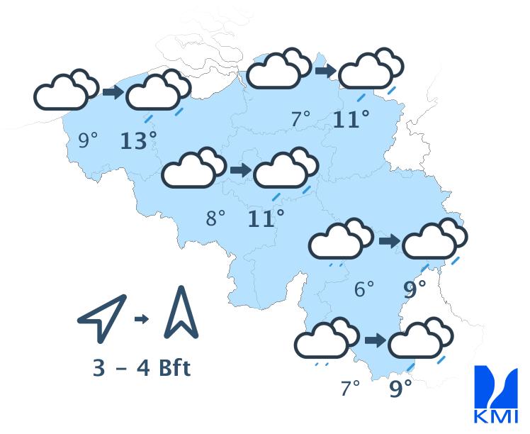 Maandagochtend is het in de meeste streken droog met wat lage bewolking en veel hoge wolkenvelden. In het Ardens reliëf is er kans op slecht zicht. Ten zuiden van de Ardennen kan er soms wat motregen vallen. Vanaf de kust en Frankrijk trekt in de loop van de dag een regenzone over het land. Het is zacht voor de tijd van het jaar met maxima tussen 10 en 14 graden. De wind waait matig en aan zee soms vrij krachtig uit het zuiden tot zuidwesten.