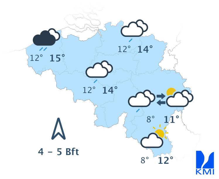 Vanavond trekken er nog buien oostwaarts over ons land met mogelijk enkele opklaringen in het westen. In het tweede deel van de nacht neemt de bewolking opnieuw toe vanaf Frankrijk met over de zuidwestelijke landshelft geleidelijk kans op regen of buien. De minima liggen tussen 5 graden in de Ardennen en 8 of 9 graden in het centrum en aan zee. De wind wordt overal stilaan matig uit het zuidwesten. Vanavond en tijdens het eerste deel van de nacht zijn er vooral aan zee en in de Hoge Venen nog rukwinden mogelijk tot 50 of 55 km/h.