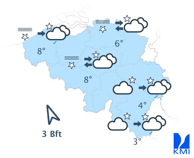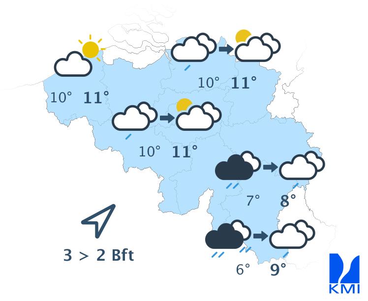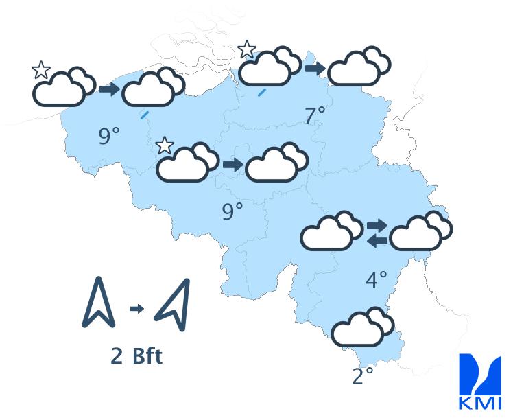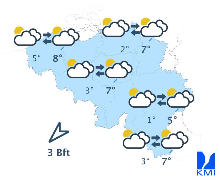 Vandaag is het zonnig in het noordoosten en in de omgeving rond Luik en bewolkt elders. Stilaan wordt het vrij zonnig op de meeste plaatsen met in de loop van de namiddag hoge en middelhoge wolken vanaf het zuiden. In het uiterste westen, langs de zuidflank van de Ardennen en in Belgisch Lotharingen is de lage bewolking hardnekkiger en blijft het mogelijk de hele dag bewolkt. De maxima schommelen tussen 5 of 6 graden in de Hoge Venen en 10 of 11 graden in de Kempen bij een meestal matige wind uit zuid tot zuidzuidoost. Op de hoogten in het oosten is hij soms vrij krachtig met rukwinden rond 50 of 55 km/h.