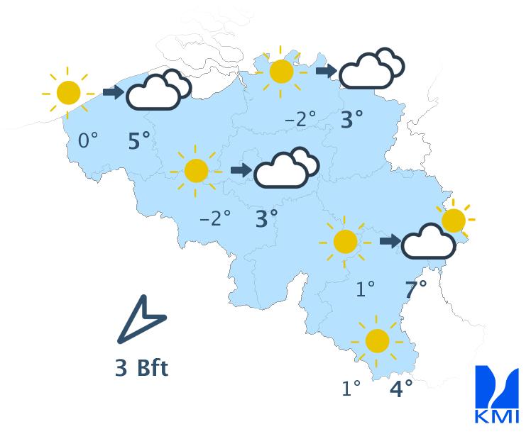 Zaterdag is het zonnig, maar geleidelijk is er kans op wolkenvelden vanuit het noorden. De maxima schommelen in het centrum rond 3 graden. Op de Ardense hoogten kan het kwik mogelijk stijgen tot 7 graden. De wind waait zwak tot matig, aan zee matig, uit het noordoosten.