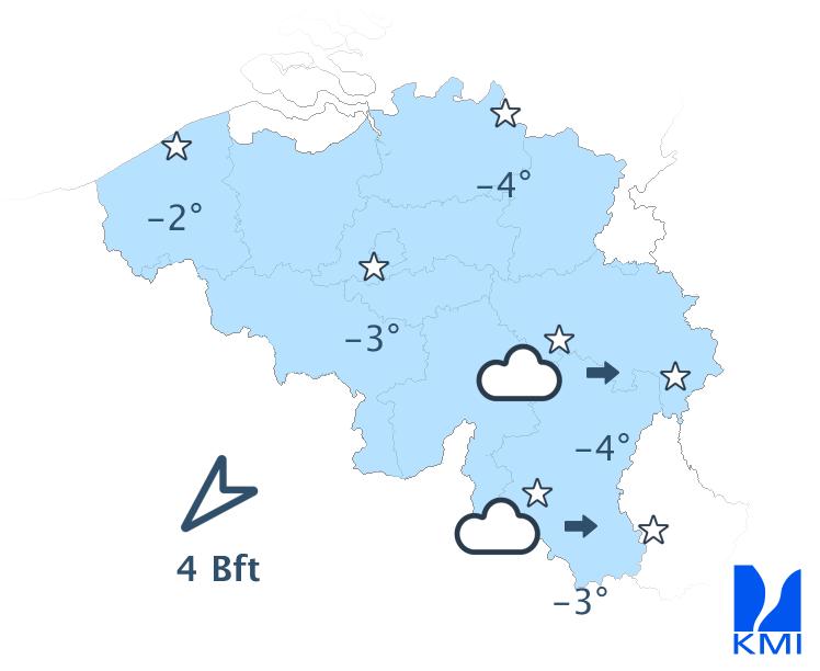 Vanavond en vannacht is het licht bewolkt tot helder. In het zuiden kunnen aanvankelijk nog enkele lage wolken aanwezig zijn, maar het blijft droog. Het vriest overal met minima tussen -2 graden aan de kust en -6 graden op de hoogten van de Ardennen. De noordoostenwind blijft nadrukkelijk aanwezig, matig in het binnenland en op de Ardense hoogten soms vrij krachtig. Aan zee waait het vrij krachtig tot soms krachtig. Rukwinden van 50 tot 55 km/u zijn mogelijk, lokaal aan de kust en op de hoogten tot 60 km/u.