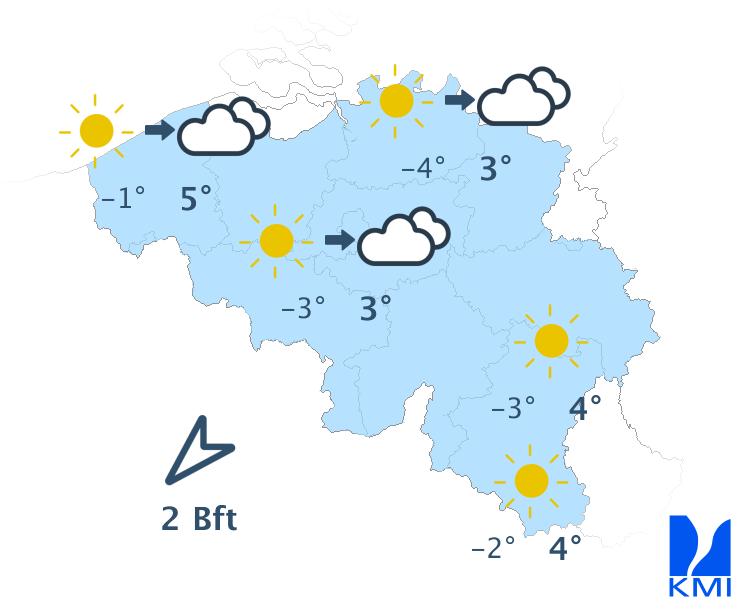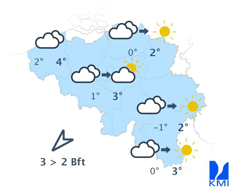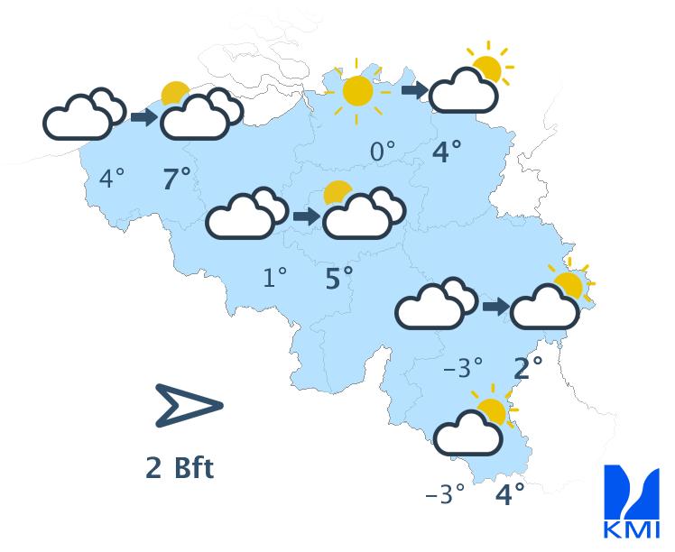 Maandag is het eerst overal zonnig. Vanuit het noorden verschijnen er snel lage wolkenvelden die geleidelijk verder trekken naar het zuiden in de loop van de dag. Enkel het uiterste zuiden van het land behoudt de opklaringen tot het einde van de namiddag. De maxima schommelen tussen 2 en 5 graden bij een zwakke tot matige noordoostenwind die draait naar het noorden tot het noordwesten.