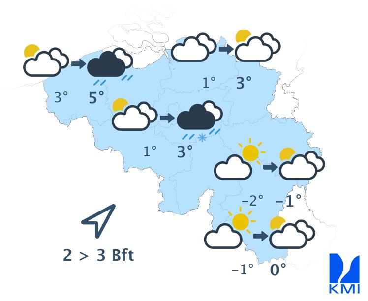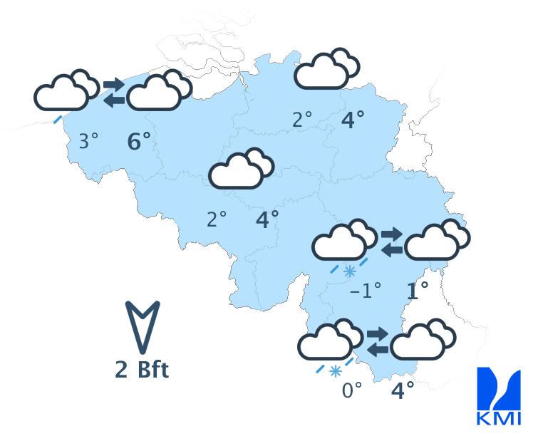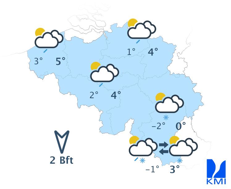 Overdag liggen de temperaturen nog steeds tussen 3 en 5 graden in het centrum en tussen 0 en 2 graden in de Ardennen. De nachten verlopen vrij koud met wijdverspreid kans op vorst. We verwachten ook neerslag, en zeer waarschijnlijk is deze winters van aard in de Ardennen en misschien ook zelfs in Laag- en Midden-België.