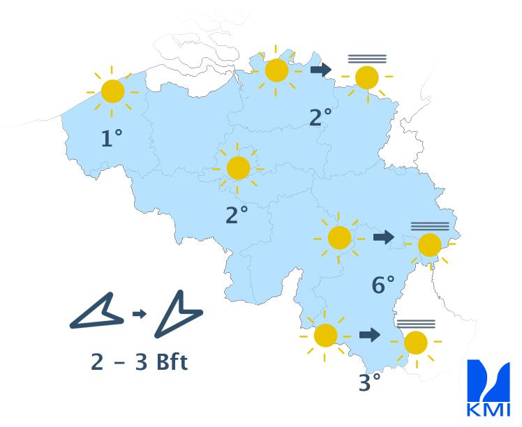 Dinsdag begint de dag opnieuw met ochtendgrijs en mist op sommige plaatsen. In de namiddag verschijnen er bredere opklaringen ten zuiden van Samber en Maas, terwijl het bewolkter blijft in Laag- en Midden-België. De maxima schommelen tussen 1 en 6 graden. De wind is zwak tot matig uit noord tot noordoost.