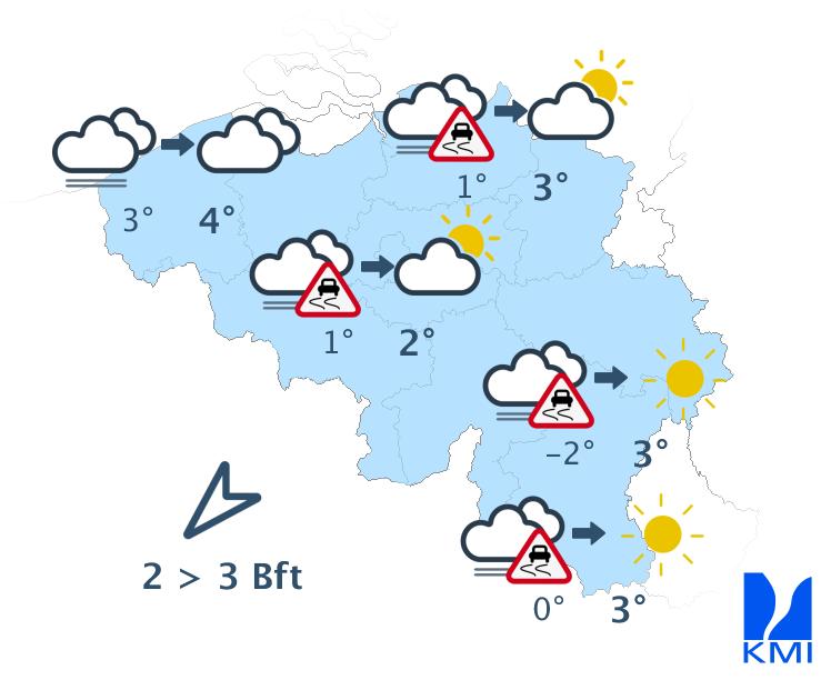 Vanavond en vannacht trekken de lage wolken verder naar het zuiden en bedekken de meeste streken, behalve de Ardense hoogten die boven de lage wolken uitstijgen. Er wordt ook dichte mist gevormd die plaatselijk zal aanvriezen. Er is ook kans op rijmplekken. De minima liggen tussen -2 tot 0 graden in de Ardennen, 0 graden in het centrum en +5 graden in het westen. De noordoostenwind is eerst zwak tot matig en wordt nadien zwak.