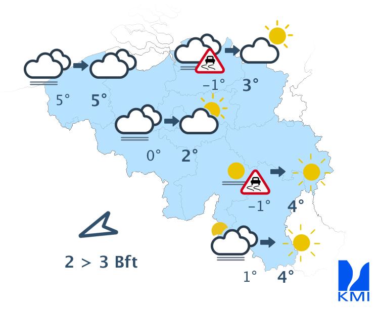 Dinsdag begint de dag grijs met veel lage wolken. Vanuit het noordoosten verschijnen er vrij snel opklaringen die zich uitbreiden naar het centrum van het land en waarschijnlijk pas in de latere namiddag ook het westen van het land bereiken. De maxima schommelen tussen 1 graad op de Ardense hoogten en 7 graden aan de kust. Er staat een zwakke wind uit noordelijke richtingen.