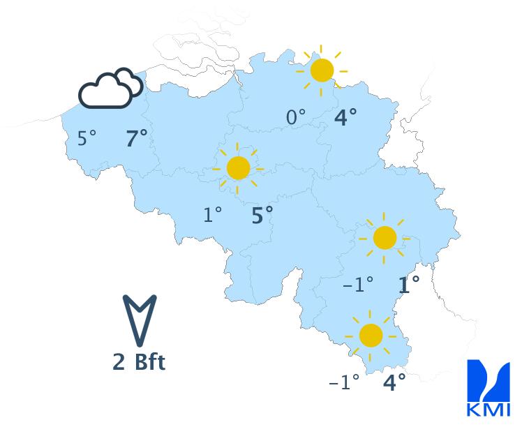 Maandag is het eerst overal zonnig. Vanuit het noorden verschijnen er lage wolkenvelden die traag verder trekken naar het zuiden in de loop van de uren. In het uiterste zuiden blijft het zonnig tot het einde van de namiddag. De maxima schommelen tussen 1 en 5 graden. De wind waait overwegend zwak uit noord tot noordoost.