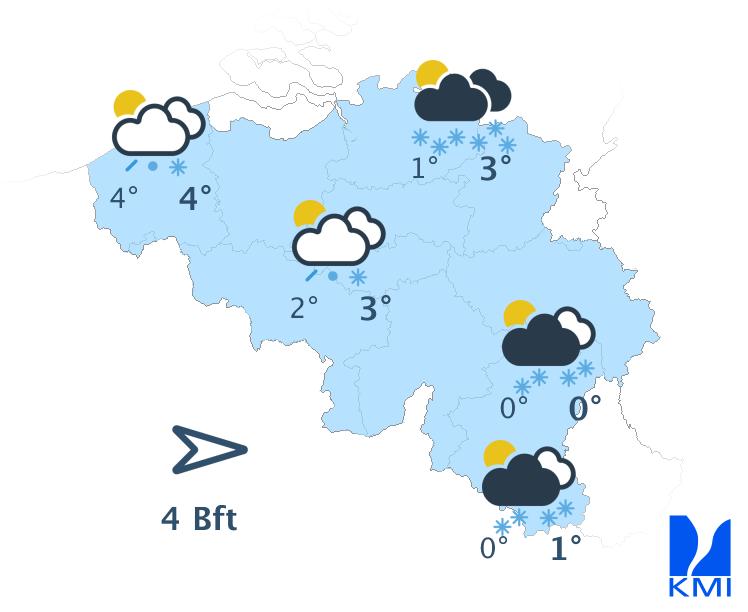 Overdag liggen de temperaturen tussen 2 en 4 graden in het centrum en rond het vriespunt in de Ardennen. De nachten verlopen vrij koud met wijdverspreid kans op vorst. Ook de kansen op (winterse) neerslag blijven aanwezig.