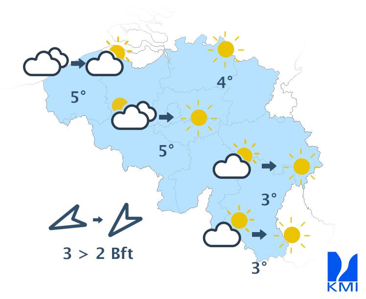 Zondag begint de dag met veel ochtendgrijs, behalve op de Ardense hoogten waar het zonnig is van in de ochtend. In de loop van de uren wordt het ook zonnig in de andere streken ten zuiden van Samber en Maas. In de namiddag verschijnen er ook geleidelijk opklaringen in het centrale deel van het land waar het wisselend bewolkt wordt met steeds bredere opklaringen en stapelwolken. In het westen blijft het zwaarbewolkt. De maxima schommelen tussen 1 en 3 graden in het centrale deel van het land, 3 tot 4 graden in de Ardennen en 5 graden aan de kust. De wind is zwak tot matig uit oost tot noordoost.