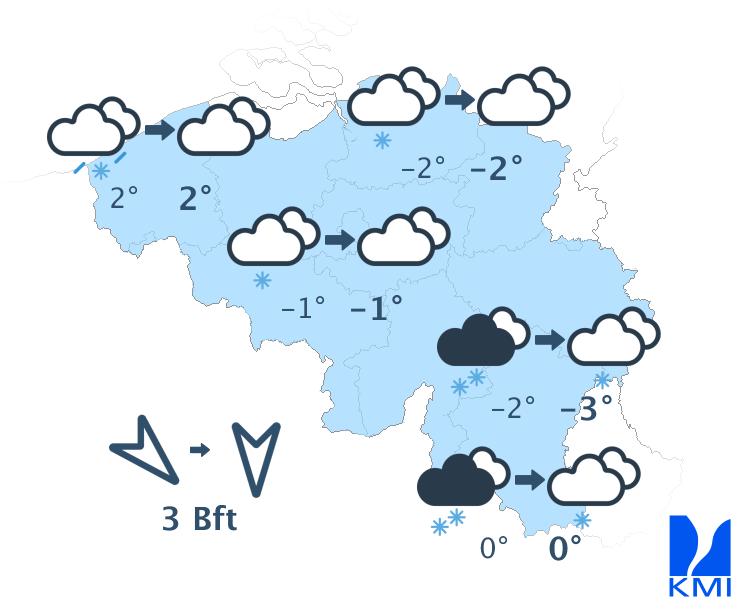 In de loop van de middag wordt het vanuit het noorden geleidelijk droger. De maxima worden vroeg in de dag bereikt: van -2 graden in de Hoge Venen tot +4 graden aan zee. In de loop van de dag daalt het kwik enkele graden.