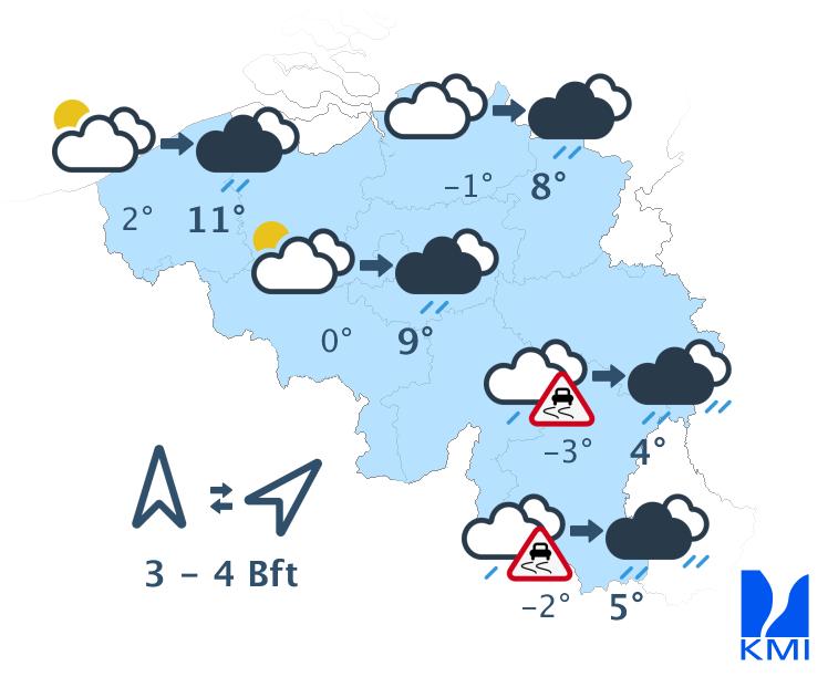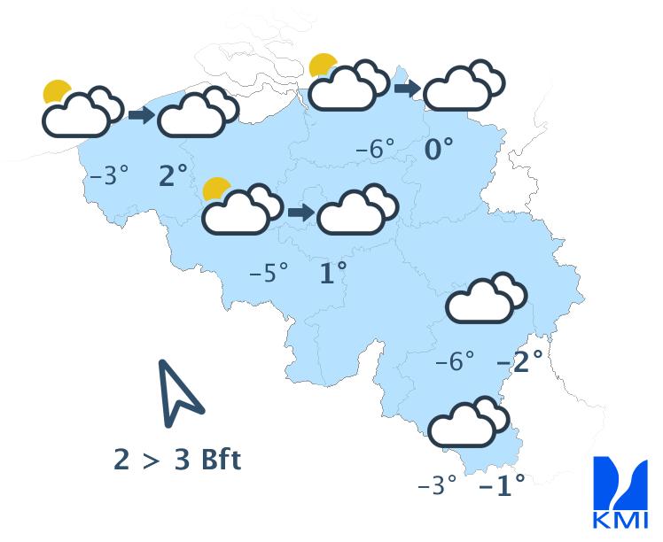 Vandaag blijft het bewolkt met nog sneeuwval (en eventueel smeltende sneeuw of korrelhagel in het uiterste westen). De neerslagintensiteit neemt vanaf het noorden geleidelijk af en in de namiddag wordt het in de meeste streken overwegend droog. Het wordt nog een iets kouder met rond de middag temperaturen rond -5 graden in de Hoge Venen, -2 of -3 graden in het centrum en +1 graad aan zee. In het binnenland waait de wind matig uit noordwest tot noord. Aan zee waait hij eerst nog krachtig en later vrij krachtig uit het noorden, en later uit noord tot noordoost.