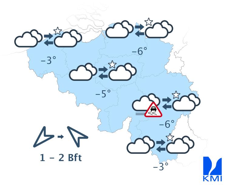Vanavond en deze nacht blijft het droog met vanaf het noordoosten opklaringen die tegen de ochtend breed kunnen worden. In de westelijke landshelft zouden er vrij veel lage wolkenvelden aanwezig blijven. De wind neemt af en is meestal zwak van kracht. Onder de opklaringen en boven het sneeuwdek wordt het zeer koud met minima rond -10 of plaatselijk lager in de Ardennen, -7 graden in de Kempen en -3 graden in het westen. Het kan overal glad worden door bevriezing van natte weggedeelten.