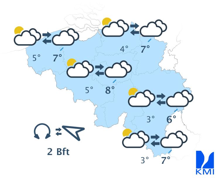 Dinsdag start droog en bewolkt, maar stilaan verwachten we lichte regen vanaf de Franse grens. Deze regen trekt van zuid naar noord over het land. In de loop van de namiddag wordt het droog met enkele opklaringen bezuiden Samber en Maas. In Vlaanderen blijft het veelal bewolkt maar wordt het ook daar tegen het einde van de namiddag droog. De maxima schommelen tussen 3 of 4 graden in de Hoge Venen en tot 10 à 11 graden in Vlaanderen. De wind is matig uit zuidelijke richtingen.