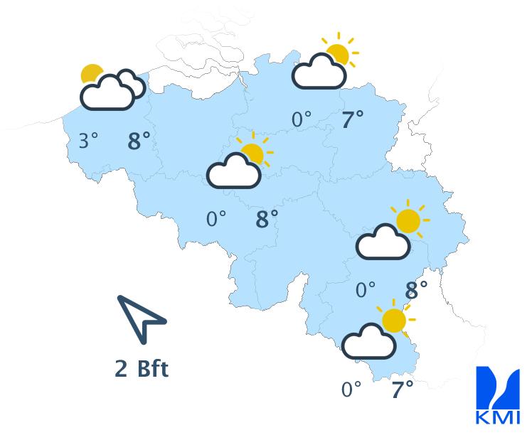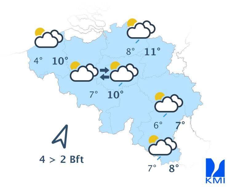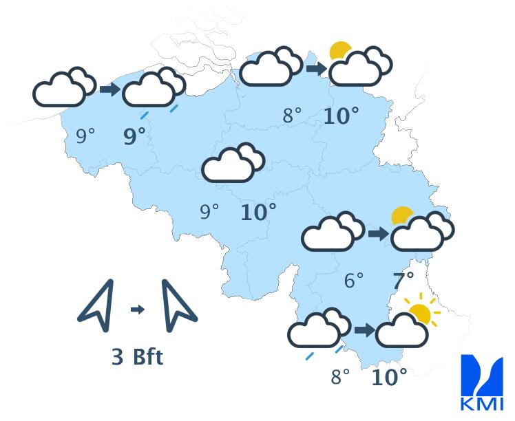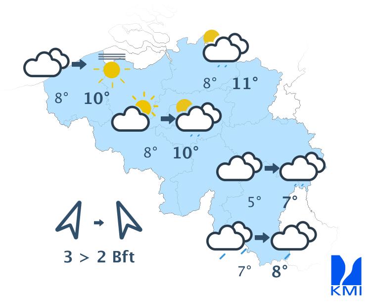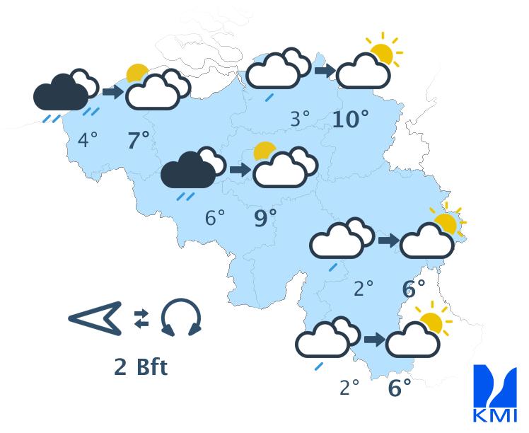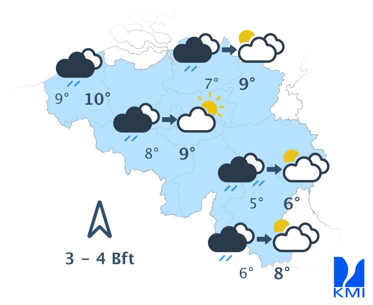 Morgen is het meestal zwaarbewolkt met in de ochtend nog tijdelijk kans op wat lichte regen. In de namiddag wordt het op de meeste plaatsen droog en verschijnen er enkele korte opklaringen. Enkel in het westen en vooral aan de kust blijft het zwaarbewolkt met kans op lichte regen. De maxima schommelen tussen 6 en 10 graden bij een matige zuiden- tot zuidzuidwestenwind.