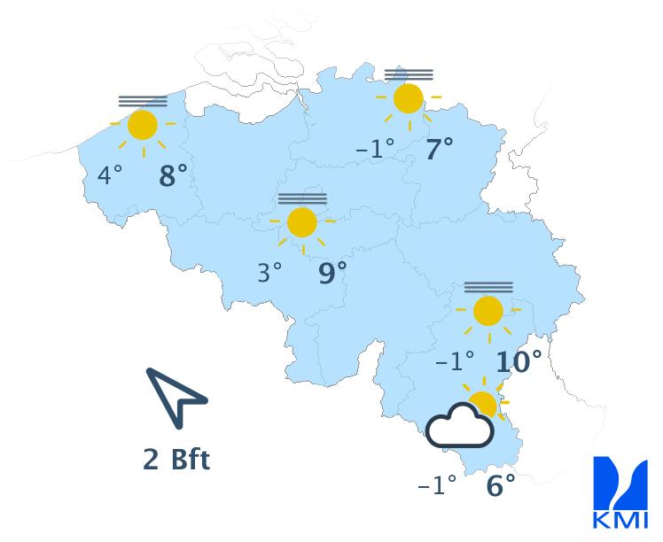 Na het eventuele ochtendgrijs lijkt het ook dinsdag en woensdag droog te blijven met eventueel zelfs brede opklaringen. Richting kust is het mogelijk bewolkter met wat meer kans op neerslag. De maxima schommelen in het centrum tussen 7 en 9 graden.