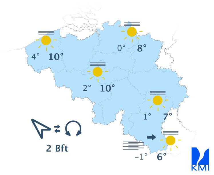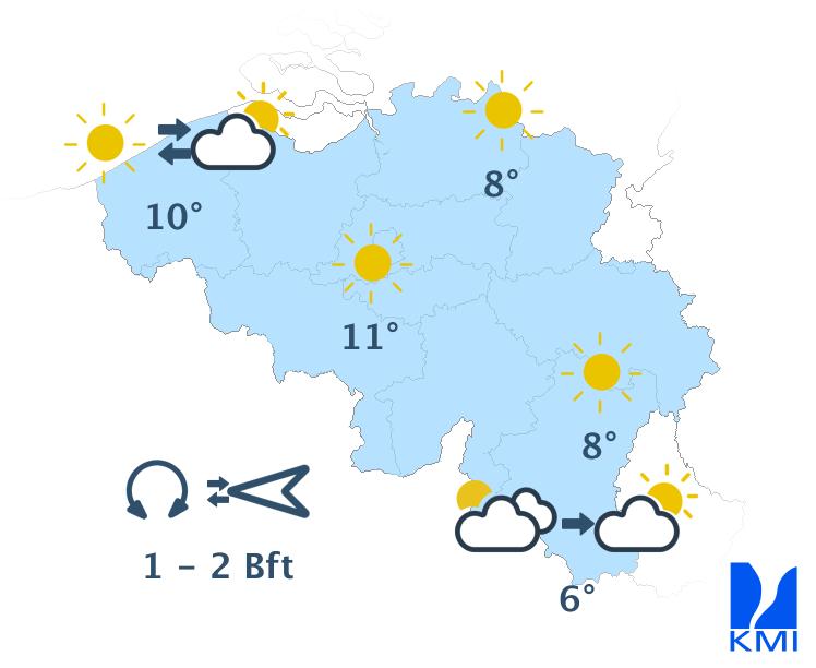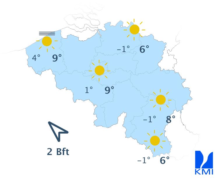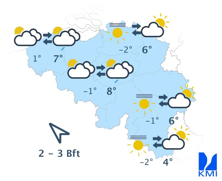 Vandaag blijft het droog en rustig met zon en hoge en middelhoge wolkenvelden. De maxima schommelen van zo'n 7 graden in de Oostkantons en lokaal 12 graden in de provincie Henegouwen. De wind is meestal zwak uit het oosten en soms matig op de hoogten in het oosten.