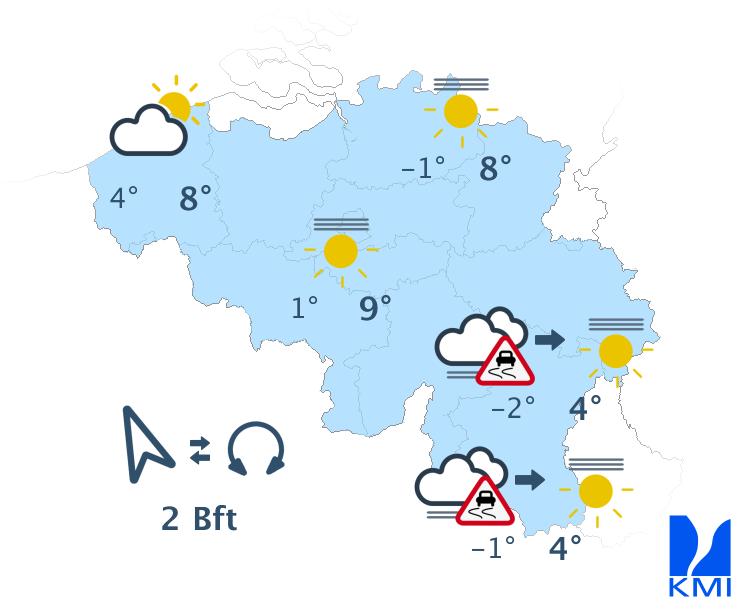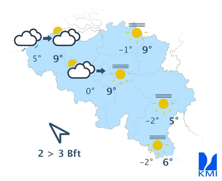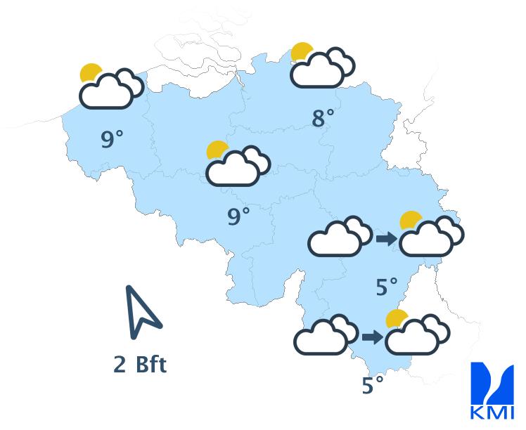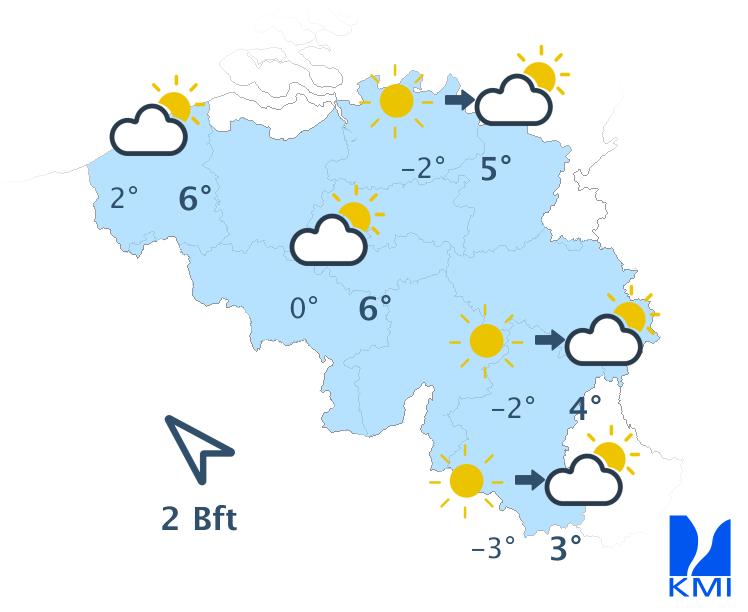 Dinsdag is het vrij zonnig met soms wat hoge bewolking. Na een vrij koude nacht met nachtvorst in de Ardennen en plaatselijk ook in het centrum, schommelen de maxima tussen 5 en 9 graden bij een zwakke zuidoostenwind of uit veranderlijke richtingen.