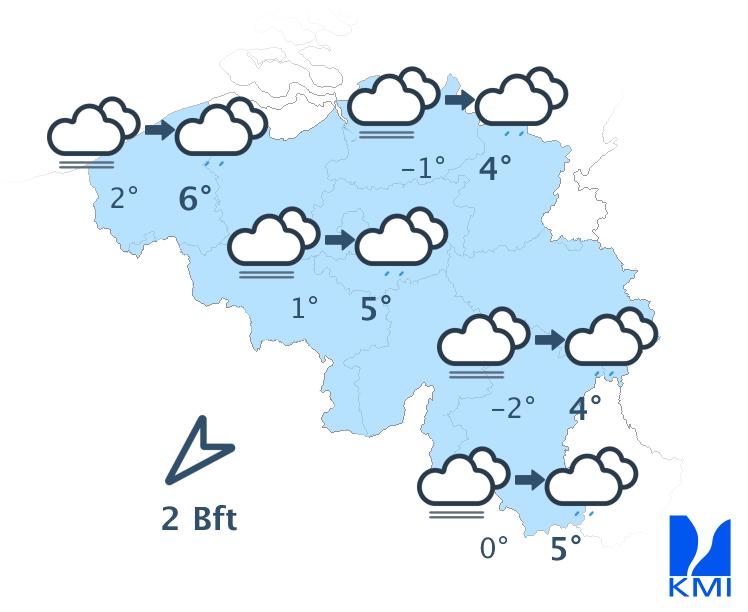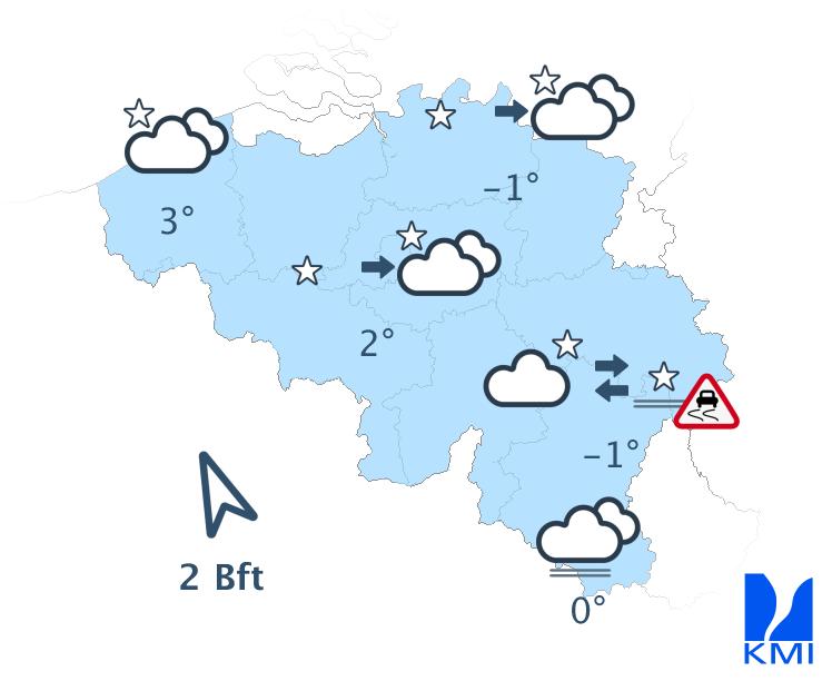 Vanavond is het eerst helder of lichtbewolkt. In de loop van de nacht komen er meer hoge en middelhoge wolkenvelden opzetten vanuit het zuidwesten. Er kan ook laaghangende bewolking gevormd worden langs de zuidelijke flank van de Ardennen en daar het zicht soms beperken. Het koelt af tussen -2 en +3 graden, in de Oostkantons lokaal tot zo'n -6 graden. De wind is zwak tot soms matig uit oost tot zuidoost en later uit zuid tot zuidoost.