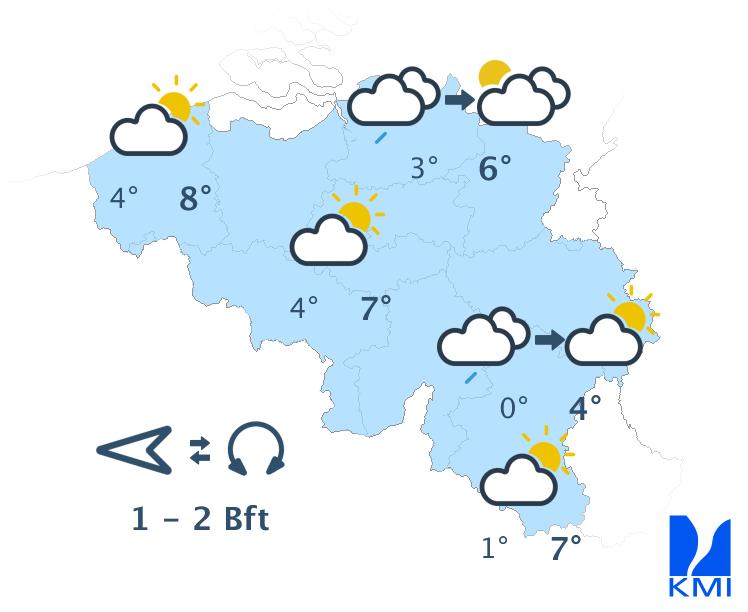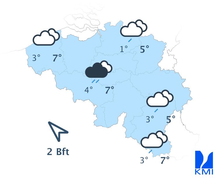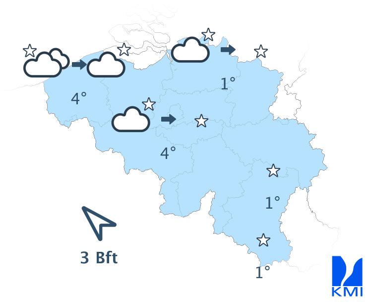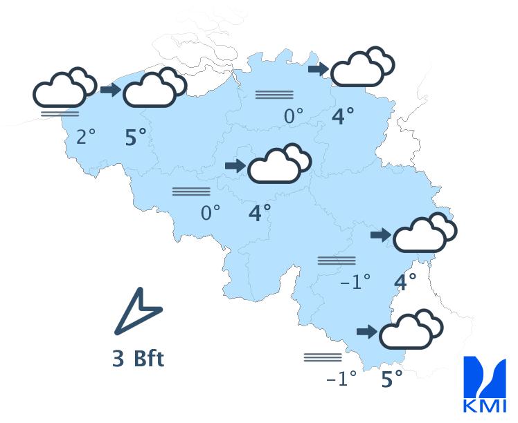 Vannacht wordt het vanaf het westen bewolkt en sleept een regenzone over het westen met misschien af en toe wat lichte regen tot het centrum van het land. Bezuiden Samber en Maas is er kans op (soms aanvriezende) mist en lokaal rijm- en/of ijsplekken. De minima liggen tussen -2 en 0 graden in het oosten, 2 of 3 graden in de Kempen en 6 graden elders. De wind is matig en wordt vrij krachtig aan zee uit zuidzuidoost.