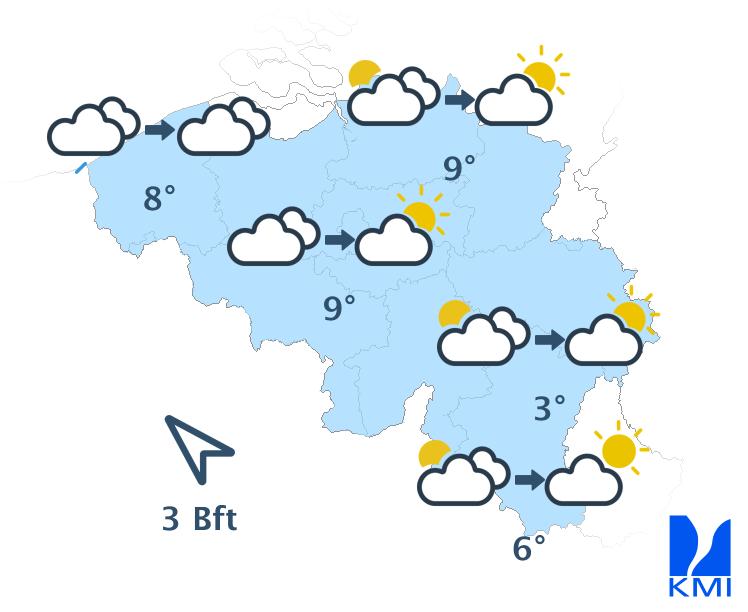 Vrijdag begint de dag met veel lage wolken. Geleidelijk krijgen we opklaringen maar in de loop van de namiddag verschijnt er opnieuw meer bewolking vanaf de Franse grens en kan er een spatje regen uitvallen in het westen van het land. De maxima schommelen tussen 6 en 9 graden.