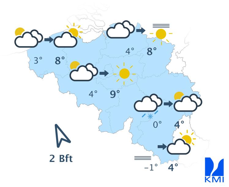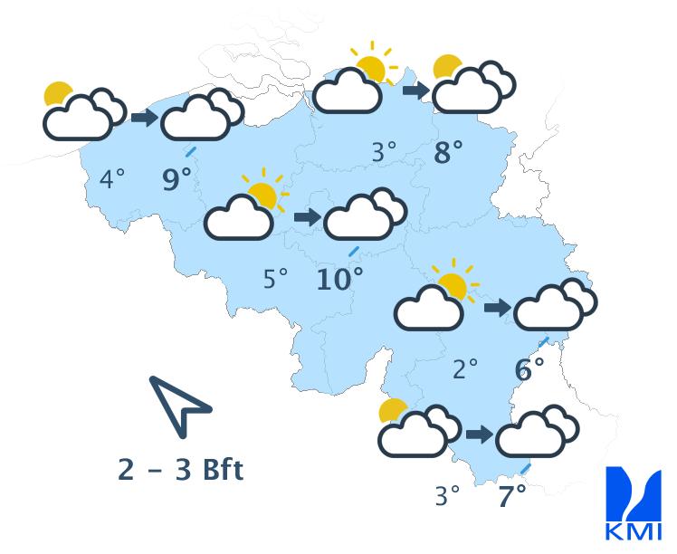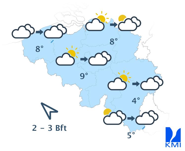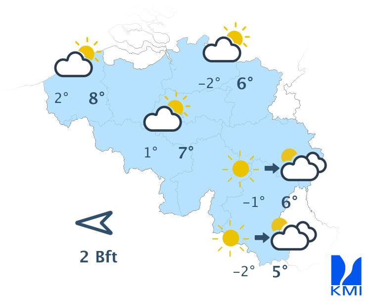 Vandaag begint op veel plaatsen met brede opklaringen maar de bewolking neemt snel toe vanaf de Franse grens. In de namiddag wordt het zwaarbewolkt met vooral in het westen en het centrum van het land kans op een spatje regen. De maxima liggen tussen 3 en 8 graden ten zuiden van Samber en Maas, rond 8 graden aan de kust en rond 9 à 10 graden in het centrum. De wind waait zwak tot matig uit oost tot zuidoost, later ruimend naar zuidoost tot zuidzuidoost. Aan zee waait de wind matig.