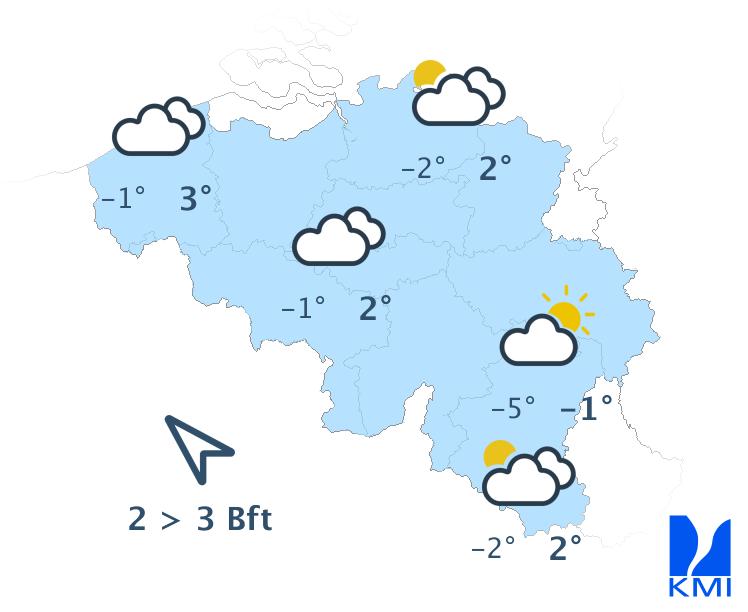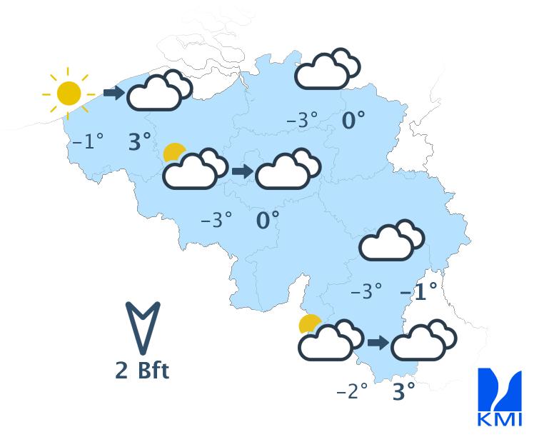 Maandag is het rustig, koud en overwegend droog met een vaak bewolkte hemel. De maxima liggen tussen -2 en +2 graden. De wind waait zwak uit het noordoosten of uit veranderlijke richting.