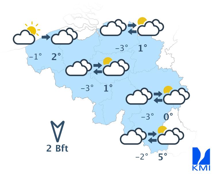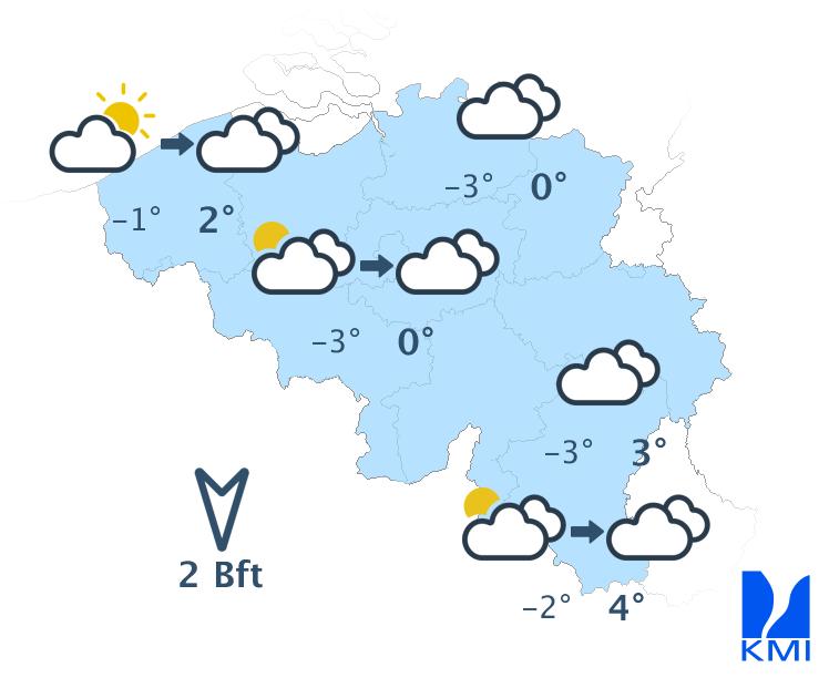 Maandag is het veelal bewolkt en overwegend droog. Het is vrij koud met maxima rond +1 à +2 graden in het centrum. De wind is zwak veranderlijk.