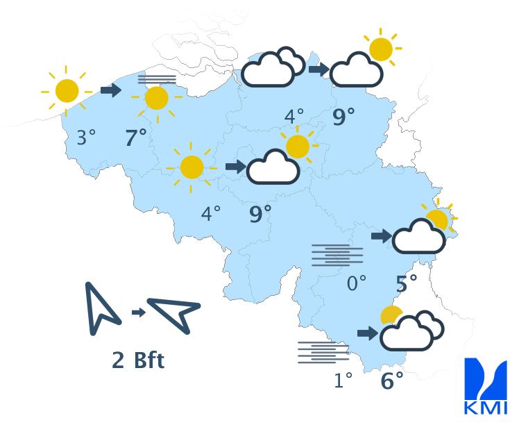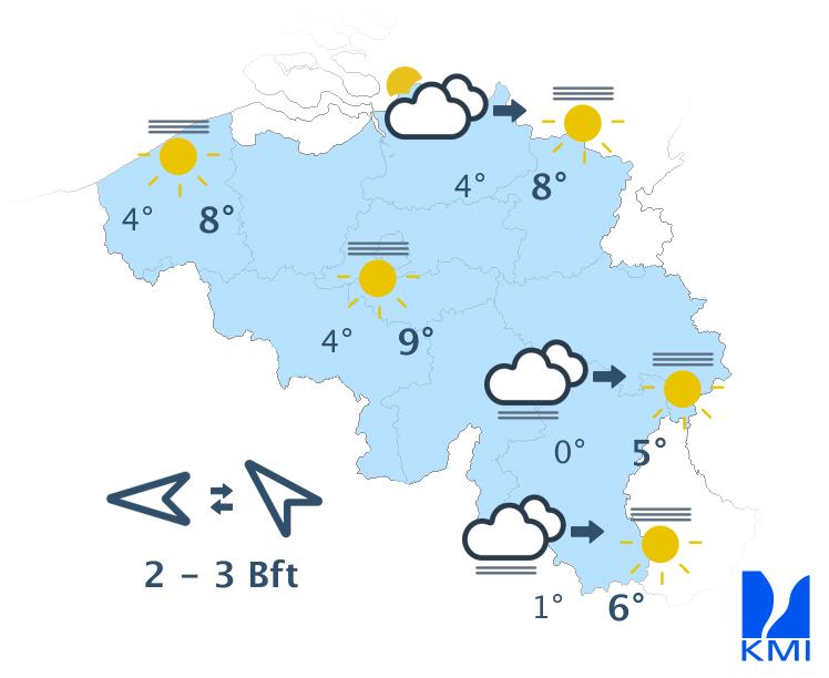 Morgen wordt het, na een vrij bewolkte start in het oosten van het land met plaatselijk mist in de Ardennen en nog enkele sneeuwvlokken in de streken nabij Duitsland, overal vrij zonnig met soms een door hoge wolken versluierde zon. Het wordt zacht voor de tijd van het jaar met maxima van 4 graden in de Hoge Ardennen tot plaatselijk 9 graden in Vlaanderen. De wind is meestal zwak uit oost tot zuidoost.