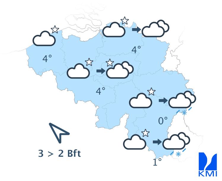 Vannacht komen de opklaringen vooral in het westen van het land voor. In het oosten wordt het opnieuw bewolkter en kan er wat lichte neerslag over de Ardennen trekken. In de Hoge Venen zijn ook enkele sneeuwvlokken mogelijk. In de Ardennen vormen zich lage wolken die plaatselijk het zicht kunnen beperken. De minima liggen tussen 0 graden in de Hoge Venen en lokaal 4 graden in het centrum en aan zee. De wind is zwak tot tijdelijk matig uit zuidoost.