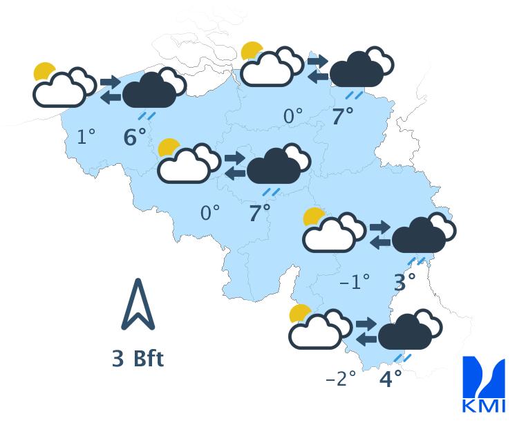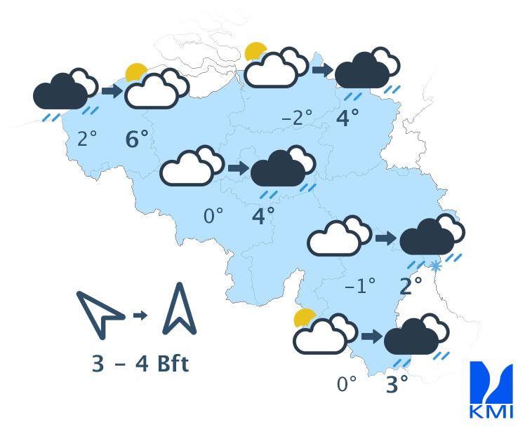 Dinsdagochtend is het zwaarbewolkt en gaat het geleidelijk regenen over het westen en het centrum. Over het oosten is het aanvankelijk nog droog met enkele opklaringen. In het begin van de namiddag beïnvloedt de regenzone het hele land met op de Ardense hoogten kans op smeltende sneeuw. Later in de namiddag wordt het over het westen droog met enkele opklaringen. We halen maxima van 1 graad in de Hoge Venen tot 6 graden in het uiterste westen. Er waait eerst een matige en zee soms een vrij krachtige zuidoostenwind. In de namiddag draait hij naar zuidelijke richtingen.