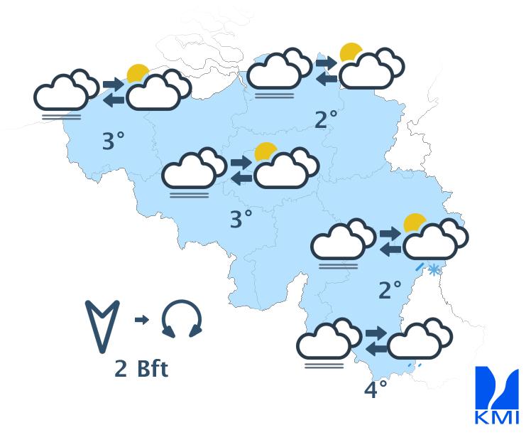 Vannacht is het nevelig met veel lage wolken; er is kans op (aanvriezende) mist, vooral in de Ardennen. Zeer lokaal kan er wat motregen vallen, maar het blijft op de meeste plaatsen droog. In de loop van de nacht verschijnen er enkele opklaringen, maar al snel neemt de bewolking vanaf het westen opnieuw toe. Naar de ochtend gaat het regenen over het uiterste westen. De minima, die in het begin van de nacht worden opgetekend, schommelen tussen -2 graden in de Hoge Ardennen en +4 graden over het westen. De zwakke en veranderlijke wind wordt matig uit zuidoost.