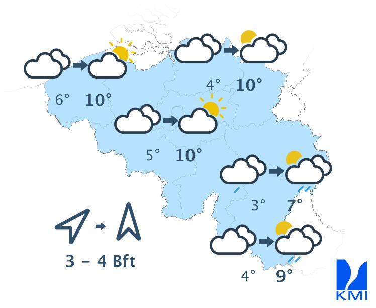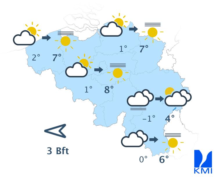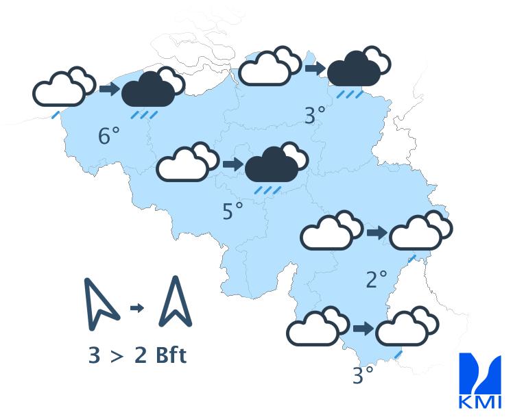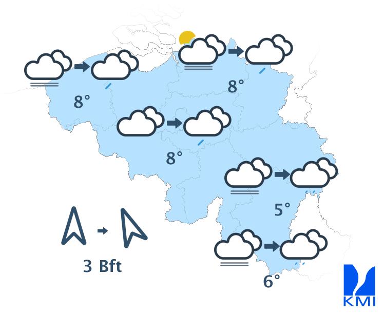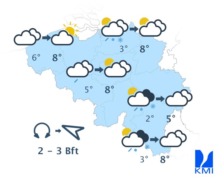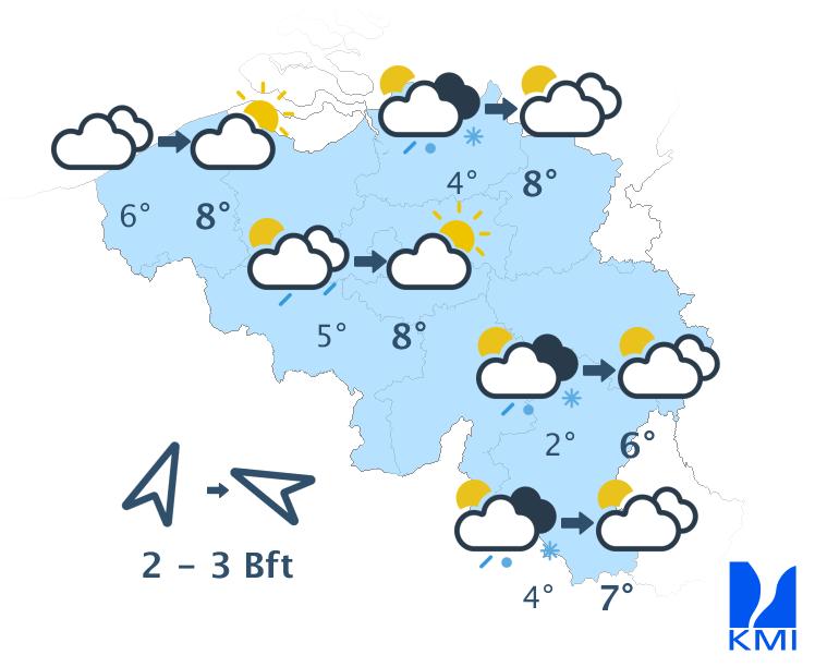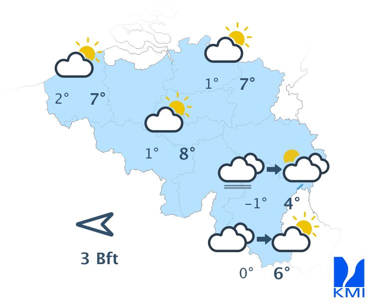 Maandagvoormiddag start zwaarbewolkt met over de oostelijke landshelft nog buien. In de Oostkantons zijn dit winterse buien. Stilaan breekt het wolkendek met aan het einde van de namiddag tijdelijk zelfs brede opklaringen. We halen maxima van 4 tot 6 graden op het Ardense reliëf en 7 of 8 graden in de meeste andere streken. De wind waait zwak tot matig en heeft eerst een voorkeur voor het zuidelijke en later oostelijke richtingen.