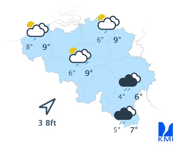 Vrijdag hangt er veel bewolking met perioden van regen. In de loop van de dag gaat dit over in buien en verschijnen er opklaringen. We halen maxima van 4 tot 7 graden in de Ardennen, 9 à 10 graden in het centrum en 11 graden langsheen de Franse grens. De wind waait zwak tot matig uit het zuidoosten, maar ruimt naar het zuiden tot zuidwesten.