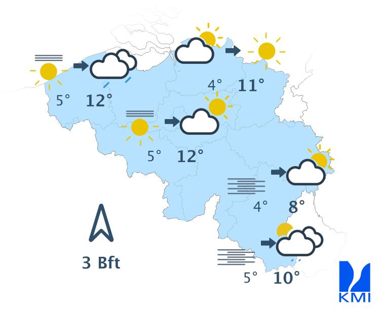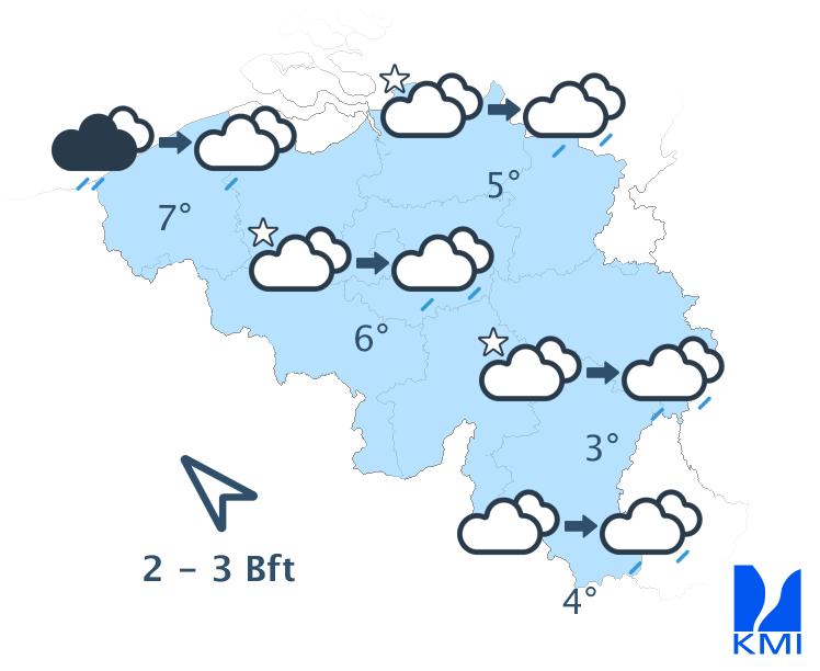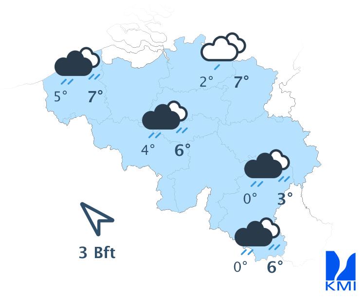 Dinsdag start met opklaringen maar geleidelijk neemt de bewolking toe vanuit het westen, gevolgd door regen. In de Ardennen kan de eerste neerslag tijdelijk winters zijn. De maxima schommelen tussen 3 en 7 graden. De wind wordt matig uit het zuidoosten.