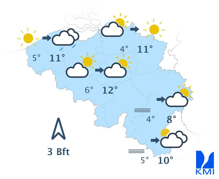 Vanavond en in het eerste deel van de nacht vallen er nog enkele buien, nadien wordt het overal droog. Er verschijnen brede opklaringen in Laag- en Midden-België. Ten zuiden van Samber en Maas worden er lage wolken en mist gevormd. De minima liggen tussen 4 en 7 graden bij een zwakke tot matige zuiden- tot zuidzuidwestenwind.