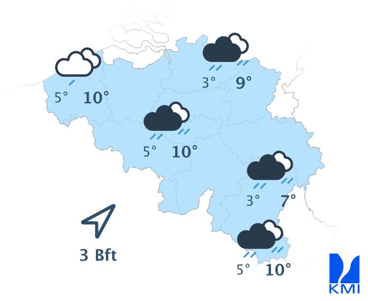 Ook donderdag krijgen we meestal veel wolken met regen of buiige neerslag. De maxima schommelen tussen 5 en 10 graden. De matige wind draait naar het westen tot het noordwesten.
