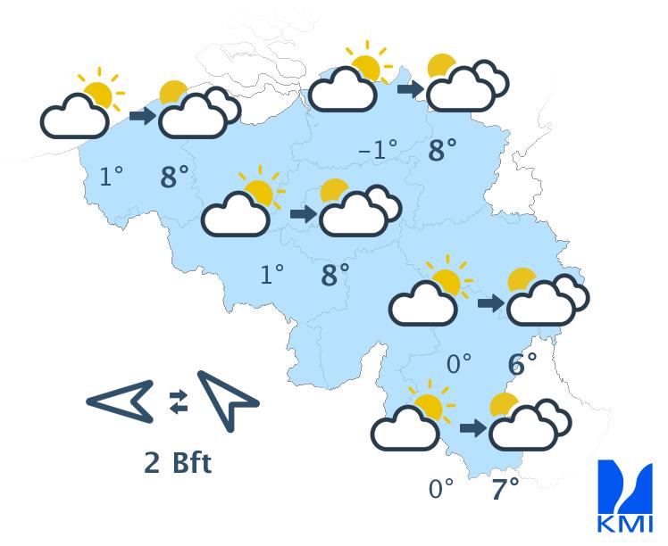 Vrijdag lijkt het wisselvallig te worden met soms buien. De neerslag kan in de Ardennen winters worden. De maxima liggen tussen 1 en 6 graden.