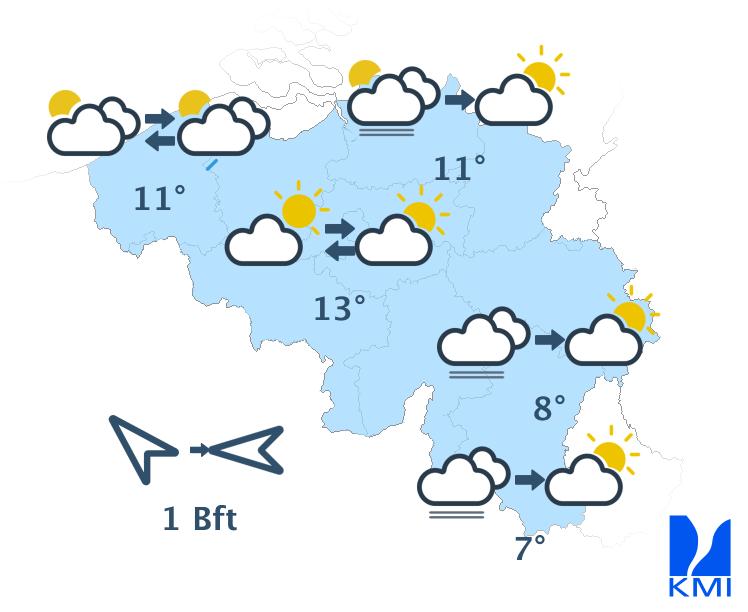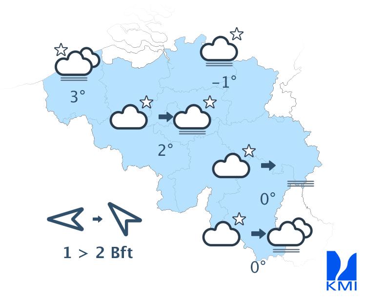 Vanavond zijn er nog wolkenvelden in de kuststreek, elders is het helder tot licht bewolkt. Vannacht wordt het op vele plaatsen nevelig met plaatselijk ook vorming van mistbanken. Aan de oostelijke en zuidelijke flank van de Ardennen is er opnieuw lage bewolking met lokaal ook dichte en/of aanvriezende mist. Tegen de ochtend kan lage bewolking vanuit Frankrijk doordringen tot het zuidwesten van het land en de kuststreek. De minima liggen tussen -2 à -3 graden in sommige Ardense valleien en +2 of +3 graden in de grootsteden en aan zee. De wind is eerst zwak uit oost tot zuidoost, later zwak tot matig uit zuidoost.